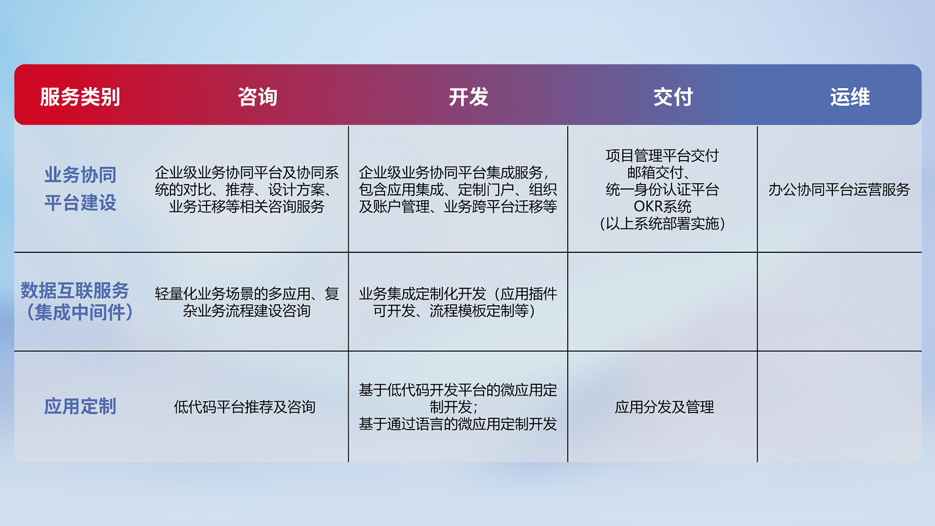 针对钉钉、、企微、、IDaas等平台级产品提供产品的规划、、方案、、交付、、、、定制化开发等服务,,,实现如统一协同办公、、智能客户服务、、、、混合会议管理、、、智能数据查询、、、等业务场景,,,,实现数字化转型。。。。